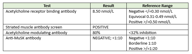Ocular myasthenia gravis was suspected in this patient that presented with recent-onset ptosis of the right eye that worsened with fatigue and had a positive forced eyelid closure test. Serologic testing for myasthenia gravis was ordered and included acetylcholine receptor binding antibody, striated muscle antibody screen, acetylcholine receptor modulating antibody (anti-AChR), and anti-muscle-specific kinase antibodies (anti-MuSK). Given the systemic implications of Horner’s syndrome and the easy access to radiologic testing, a chest x-ray was also ordered to evaluate for Pancoast tumor, which was negative. Results for serologic testing came back within several weeks and are summarized in Table 1.