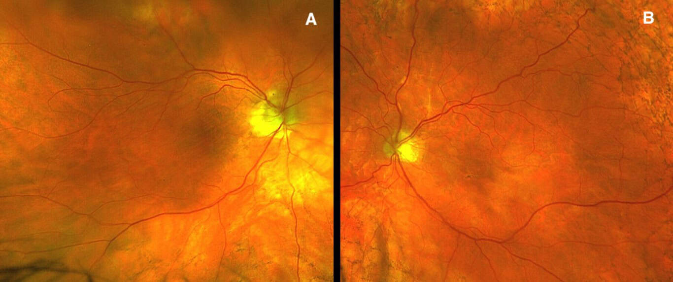 Figure 1. Fundus photo of right eye (A) and left eye (B) revealing subtle choroidal folds ST arcades.