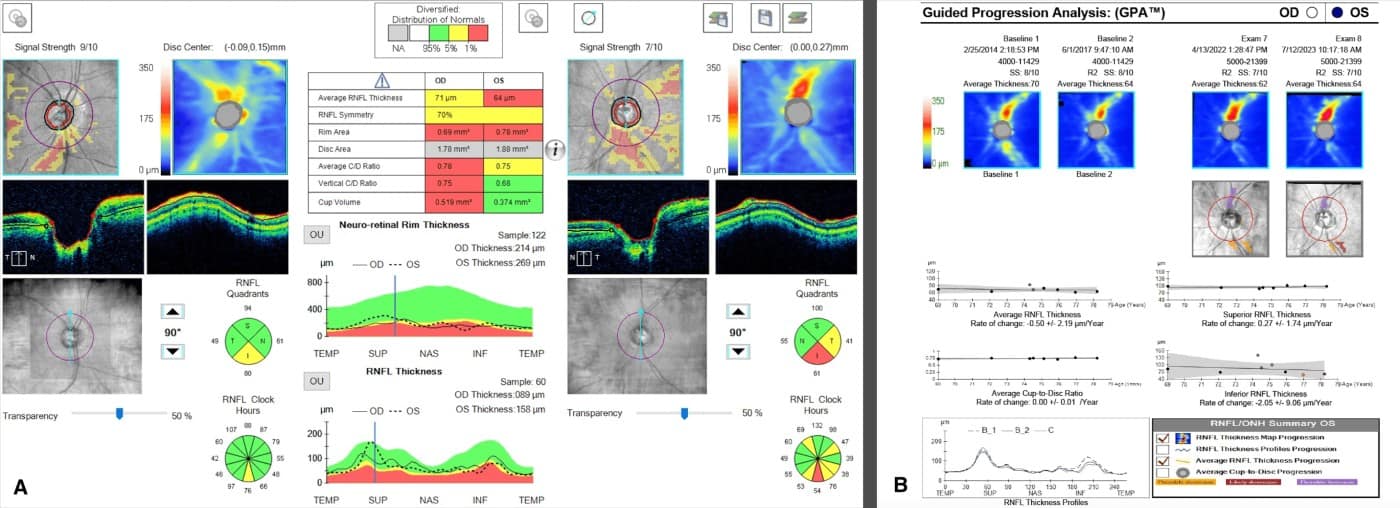 Figure 1. OCT-RNFL showed borderline thinning inferiorly in the right eye and borderline thinning temporally with thinning inferiorly in the left eye (A). Guided Progression Analysis (GPA) shows progression inferiorly in the left eye. (B)