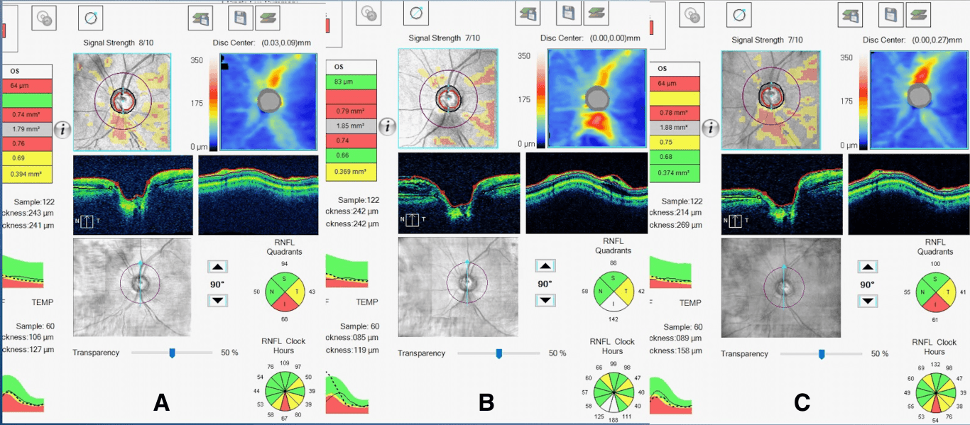 Figure 2. A) OCT RNFL of the OS eye six years prior to the current exam (and before the onset of PPRS). B) OCT RNFL of the OS four years prior to the current exam (when the PPRS was first documented). C) OCT RNFL of the OS taken at the current exam (after the resolution of PPRS).