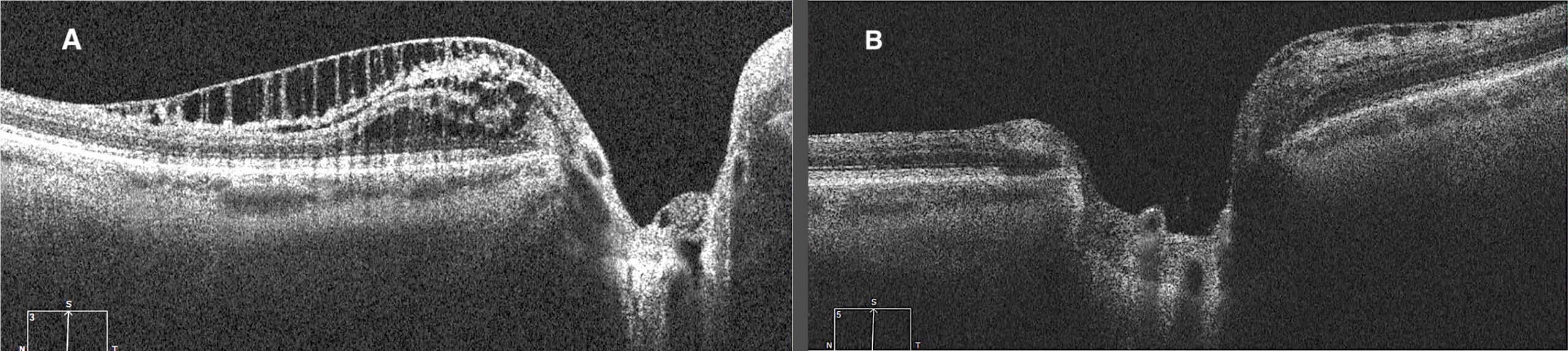 Figure 3. A) OCT of the OS of PPRS inferior to the ONH at onset (four years prior to the current exam). B) OCT of the OS of resolved inferior PPRS with a new onset PPRS superior to the ONH (taken during the current exam).