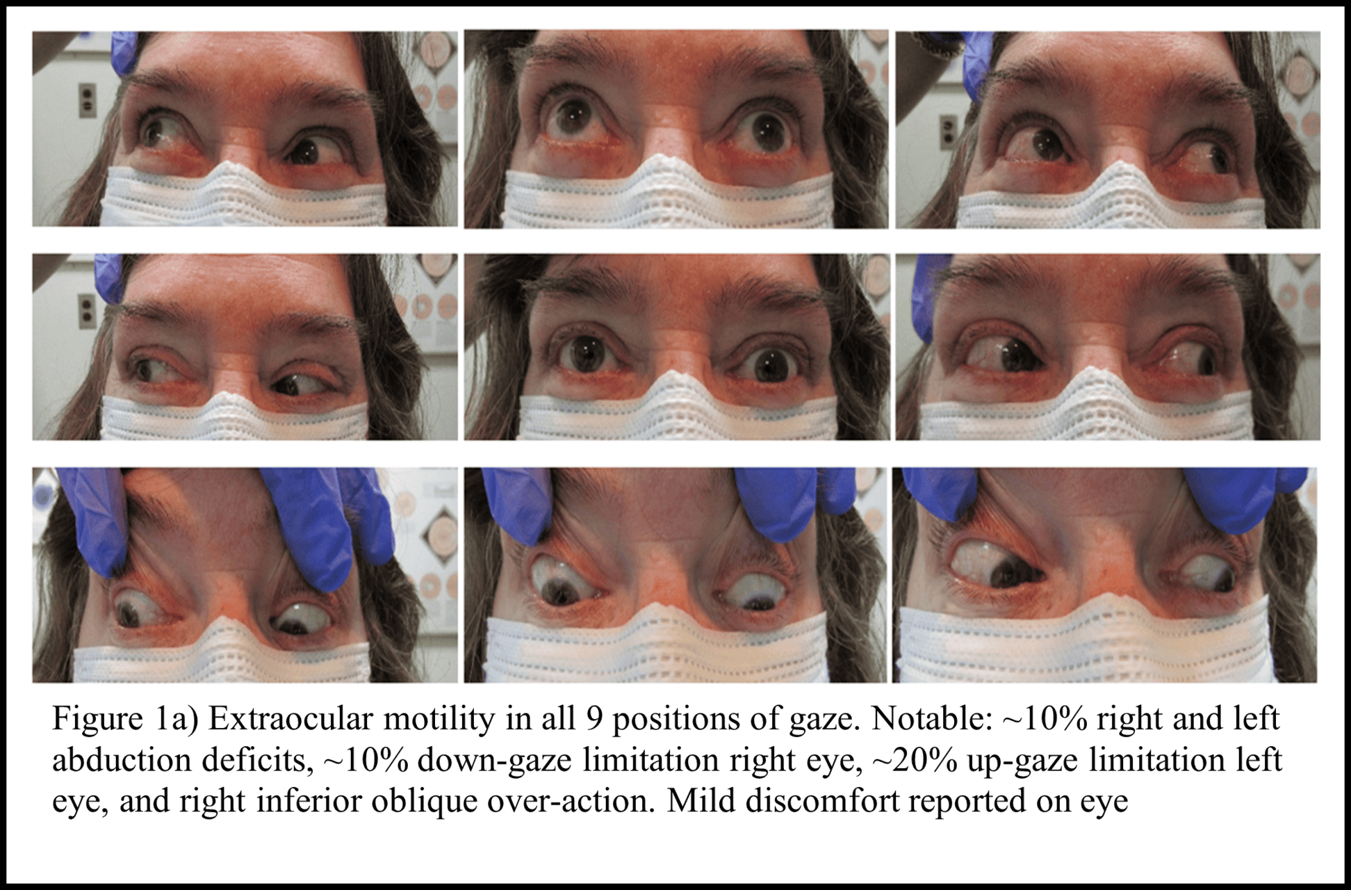 A 57-year-old white female presented for an initial eye exam complaining of intermittent episodes of binocular horizontal diplopia (ongoing for the past 2-3 months), worse at distance than near (with or without correction) and often noticed first thing in the morning upon waking. During these episodes, she associated a dull ache behind her left eye, described as a headache. She denied constant diplopia, and there was no recent history of head trauma. She also denied any other associated neurological symptoms. Her medical history was significant for obstructive sleep apnea and hypothyroidism, diagnosed two years earlier. There was no history of thyroid surgery or radioactive iodine therapy (RAI). She denied a history of hyperthyroidism or Grave’s disease. For medications, she was taking albuterol, loratadine, and levothyroxine. The patient had recently been working with her primary care provider to adjust levothyroxine to the appropriate dose, and by the time we saw her in the eye clinic she was euthyroid. Also of note, she was a former smoker with greater than 30 pack years and quit smoking two years prior.