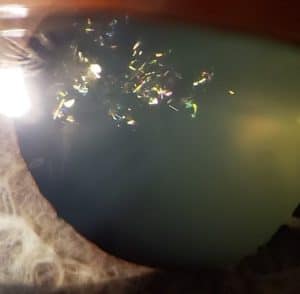 Some morphologic presentations of cataracts can be quite distinctive, with remarkable shapes and colors that create a memorable picture. A Christmas tree cataract is a rare type of lenticular opacity, usually noted as an incidental finding on routine slit lamp examination. It appears as multiple clusters of polychromatic, highly reflective needle-like crystals in the cortex. These cataracts are most often unilateral and asymptomatic, although it is possible for them to progress to visual significance.1-3