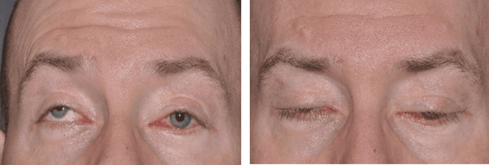 Examination revealed the best-corrected distance visual acuity of 20/40 right eye and 20/30 left eye. Extraocular motilities showed a right exotropia, greater than ten prism diopters, and a right hypertropia of three prism diopters. There was 2+ ptosis of the upper lids bilaterally and a 2 mm lagophthalmos right eye and 4 mm left eye (Figure 1). There was an over action of the frontalis muscle, causing a reduction in the blink response. He had a Bell’s reflex that positioned the eyes up and out, but still had inferior corneal exposure. There was decreased corneal sensitivity in both eyes.