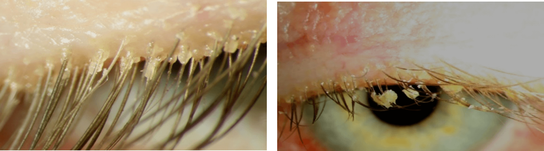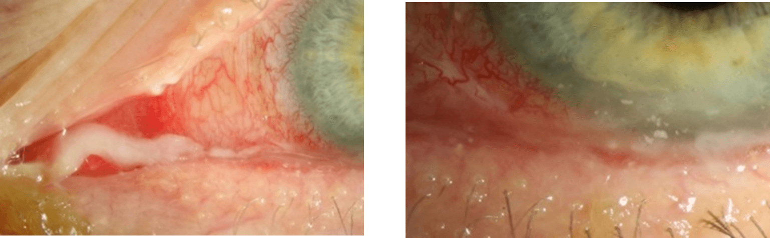 Figure 3: Left eye: anterior blepharitis and mucoid discharge; filaments and inspissated meibomian glands.