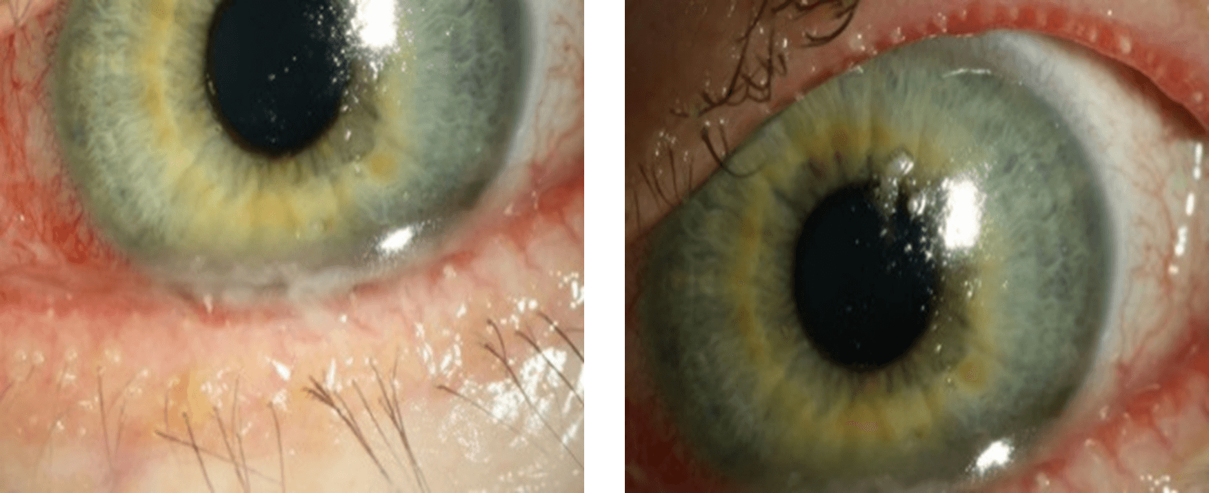 Figure 7: Minimal collarettes with persistent marginal blepharitis right eye; resolution of inferior corneal defect and infiltrate left eye.