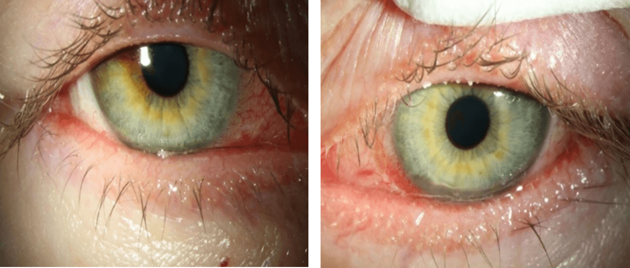 Figure 6: Improved blepharitis and less collarettes right eye; improved blepharitis and collarettes with epithelialized defect left eye.