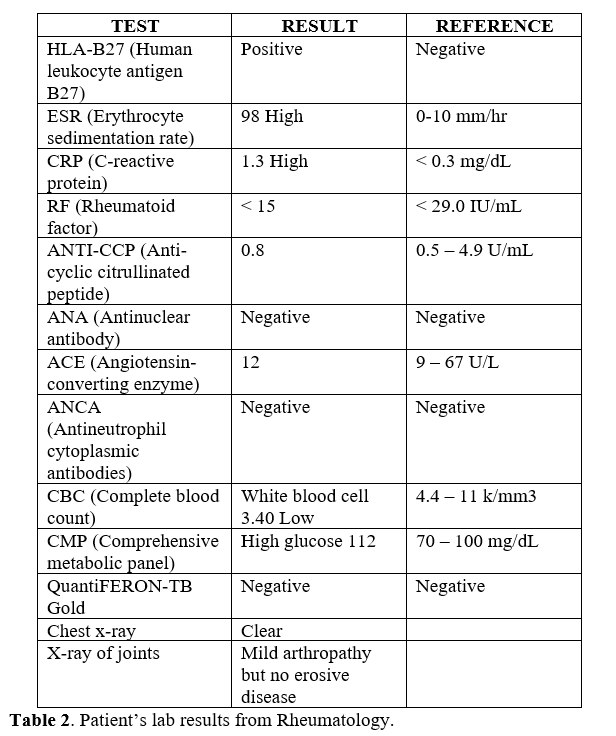 The patient was also scheduled to see rheumatology in two months following this visit to follow-up with his test results. Table 2 lists the lab results from the rheumatology appointment.