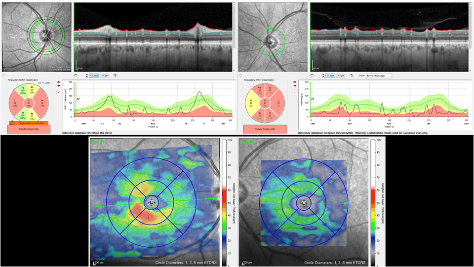 Figure 1. Spectral domain OCT. Peripapillary RNFL scans of the right eye (top left) and left eye (top right) and macular GCL segmentation of the right eye (bottom left) and left eye (bottom right).