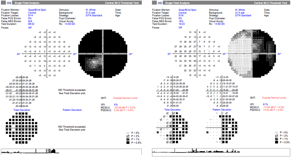 Spectral domain optical coherence tomography (SD-OCT) demonstrated significant thinning in the temporal and nasal sectors of the peripapillary retinal nerve fiber layer (pRNFL) for the right eye and diffuse pRNFL thinning in the left eye; the global pRNFL thickness was 62 microns in the right eye and 41 microns in the left eye (Figure 1). Macular ganglion cell layer OCT segmentation showed vertically-respecting nasal thinning in the right eye and diffuse decimation in the left eye (Figure 1). Automated perimetry revealed a temporal hemianopic visual field defect in the right eye (mean deviation -14.54 dB) and significant diffuse loss in the left eye (-30.08 dB) (Figure 2).