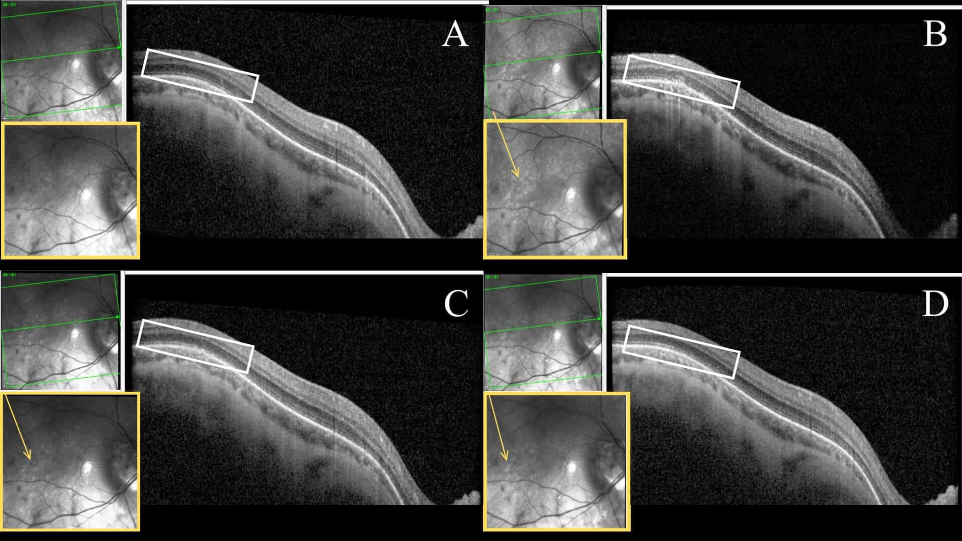 Figure 2: Serial SD-OCT images of the right eye at initial onset (A), one week (B), one month (C), 3 months (D). The white rectangle highlights retinal layers temporal to the fovea that undergo an apparent disruption with an eventual resolution at the EZ layer. The yellow box of each scan shows an enlarged infrared reflectance image. Within this imaging, hyperreflective lesions are visibly scattered throughout the posterior pole, highlighted by the yellow arrow.
