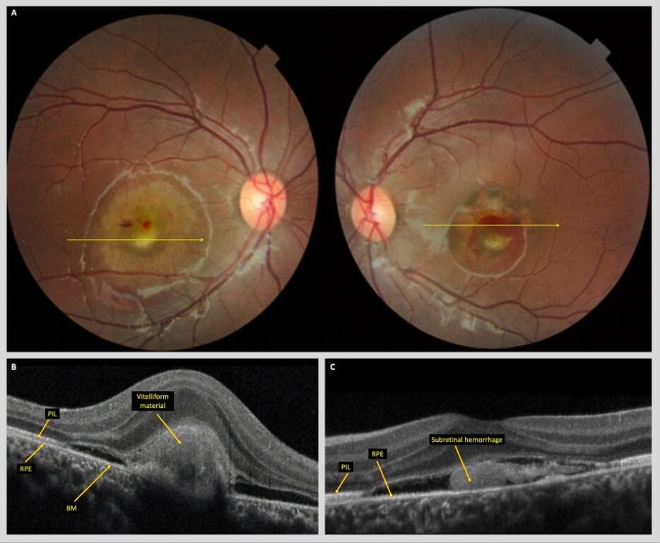 Figure 1. A) Color fundus photos of the right and left eyes of the patient’s daughter upon initial presentation at 6 years of age, demonstrating bilateral subfoveal vitelliform lesions with associated CNVM and subretinal hemorrhaging. Yellow arrows denote location of corresponding raster B scan in panels B and C. B) Spectral-domain optical coherence tomography (SD-OCT) B- scan of the right macula reveals a large subretinal vitelliform lesion with adjacent subretinal fluid. C) SD-OCT B-scan of the left macula reveals subretinal hemorrhage with subretinal fluid and neurosensory detachment. Abbreviations: PIL, photoreceptor integrity line; RPE, retinal pigment epithelium; BM, Bruch’s membrane.