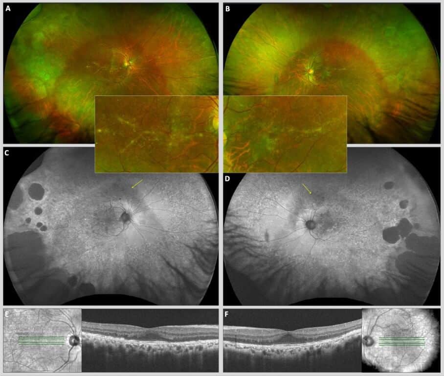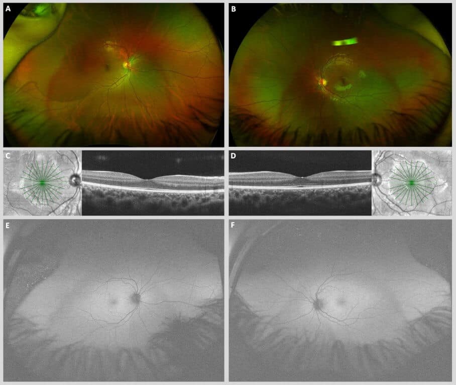 Figure 2. Ultrawidefield pseudo-color fundus photographs of the right (A) and left (B) eyes of the patient’s son demonstrating unremarkable posterior segments in each eye. Macular spectral domain optical coherence tomography (SD-OCT) B-scans of the right (C) and left (D) eyes demonstrate entirely unremarkable maculae with intact foveal contour and retinal laminations. Ultrawidefield fundus autofluorescence (FAF) photographs of the right (E) and left (F) eyes demonstrate normal iso-autofluorescence throughout the posterior segments of each eye.