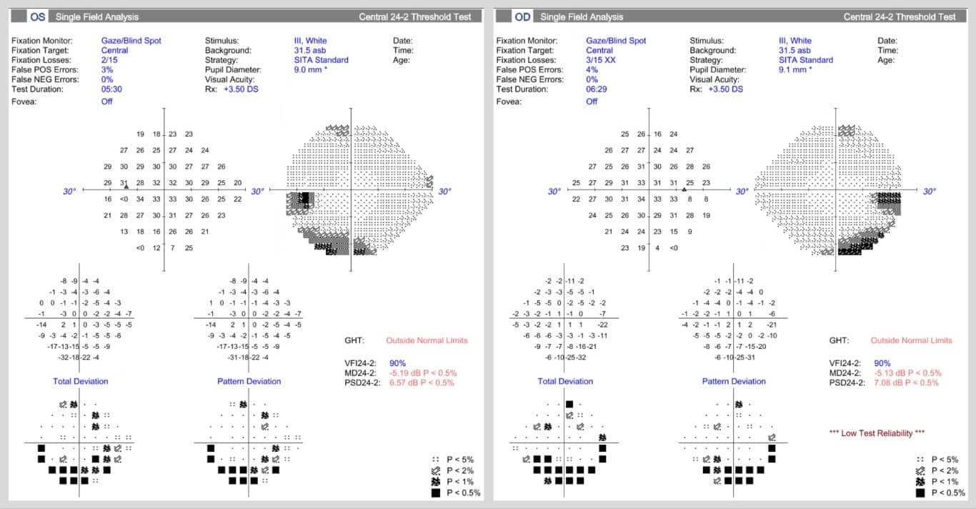 Subsequent standard automated perimetry (Figure 4) demonstrated relatively congruous inferior arcuate scotomata, most dense inferotemporal in both eyes, corresponding to areas of hypo-autofluorescence superonasal to the optic nerve head in both eyes (Figure 3C-D).