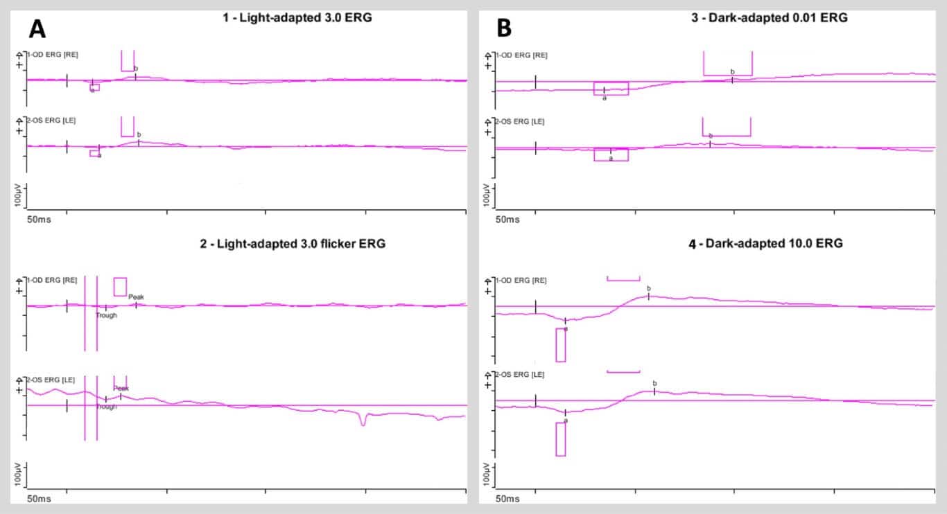 Figure 5. A) Light-adapted full-field flash electroretinogram (ERG) tracings (left panel) of the right and left eyes (top and bottom traces, respectively) demonstrating attenuated amplitudes and delayed kinetics of both the a- and b-waves. Light-adapted full-field flicker ERG tracings (right panel) of the right and left eyes (top and bottom traces, respectively) demonstrating impaired response amplitude but preserved frequency of response in each eye. B) Dark-adapted full-field flash ERG tracings with dim flash (top panel) and bright flash (bottom panel) of the right and left eyes (top and bottom traces in each panel, respectively), both demonstrating attenuated response amplitudes and delayed kinetics of the a- and b-waves in each eye.