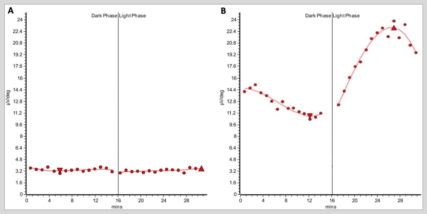 Figure 6. A) Electro-oculogram (EOG) recording of the patient’s right eye demonstrating severely decreased responses with subsequent attenuated light peak-to-dark trough (Arden) ratio. The patient’s EOGs were virtually identical between eyes; the Arden ratio of the right and left eyes were 1.10 and 1.11, respectively. B) A representative normal EOG from a different healthy patient demonstrating a robust response to both dark and light phases with a subsequent normal Arden ratio of 2.2. Normal Arden ratio: >1.80; subnormal: 1.60 – 1.80; reduced: < 1.60.